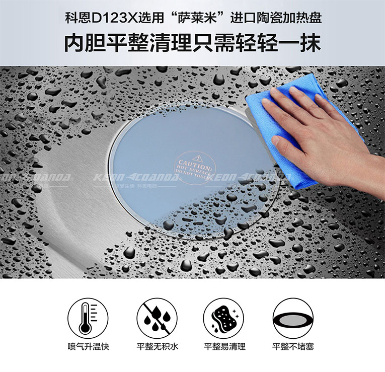 集成灶十大品牌、廚電行業(yè)十大品牌科恩D123X變頻蒸烤消一體集成灶采用噴氣式4D立體蒸,升溫僅需200秒,62L大容積蒸箱內(nèi)腔頂部兩組加熱管,四面受熱均勻,有效防止了蒸汽上升,另外,底部陶瓷加熱盤噴氣升溫快、平整無積水、易清理、不堵塞,有效避免了傳統(tǒng)蒸盤在蒸制過程中排水孔容易堵塞導(dǎo)致故障的問題,且內(nèi)膽平整清理只需輕輕一抹就能潔凈。