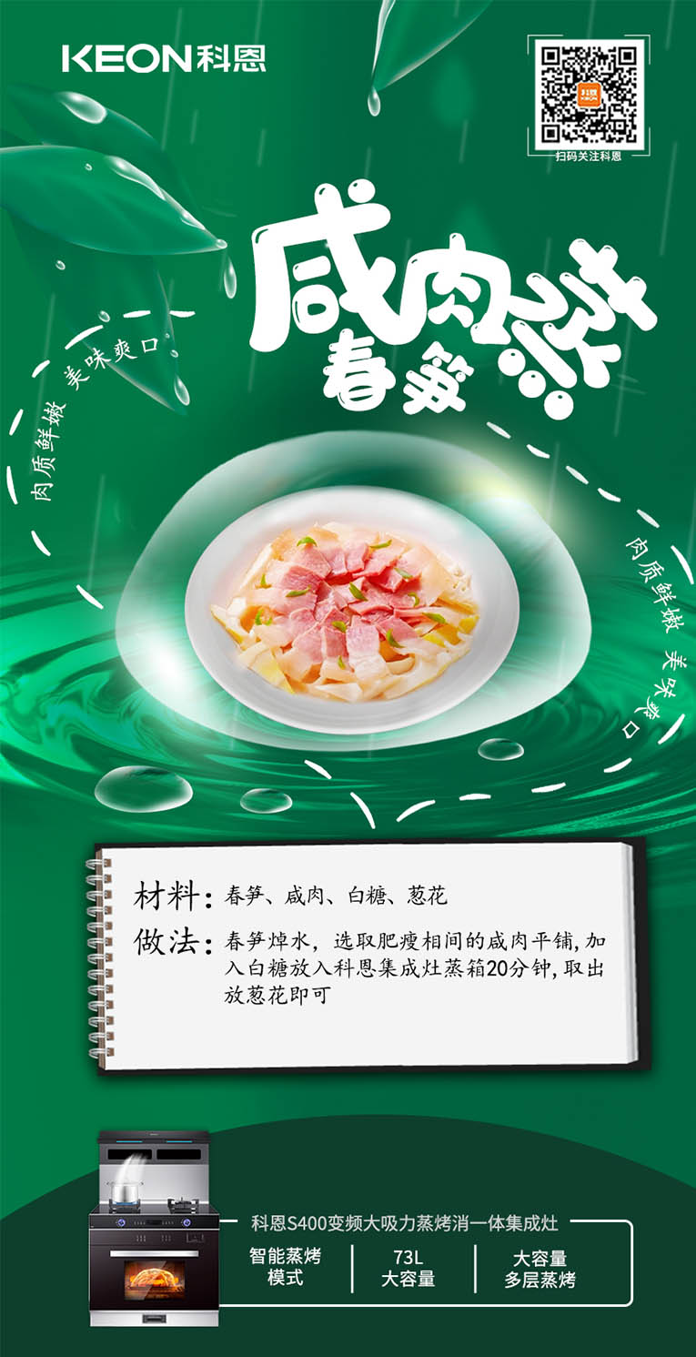 中醫認為肝主生發,故春季肝氣旺盛,肝木易克脾土,養生不當容易損傷脾臟,從而導致脾胃功能的下降。雨水時節空氣濕潤,又不燥熱,正是養生的好時機,當然首先要調養脾胃。集成灶十大品牌、廚電行業十大品牌科恩集成灶多項全能,蒸煮、煲湯、煎炸、爆炒樣樣精通,輕松應對您所需的烹飪方式,20m3/min大風量,720Pa大風壓,只留美味,不留油煙。