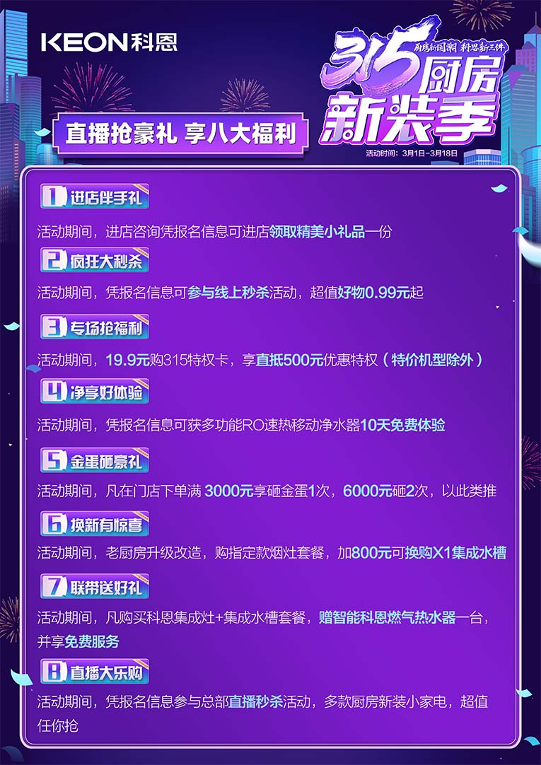 廚房新國潮,科恩新三件~科恩集成灶315廚房新裝季,八大特權(quán)限時大放送!!一進店伴手禮,活動期間進店資訊憑報名信息可領(lǐng)取精美小禮品一份;二瘋狂大秒殺,憑報名信息可參與線上秒殺活動,超值好物0.99元起;三專場搶福利,活動期間19.9元購315特權(quán)卡,享直抵500元特惠特權(quán)(特價機芯除外);四凈享好體驗,活動期間憑報名信息可獲多功能RO速熱移動凈水器10天免費體驗;五金蛋砸豪禮,活動期間凡在門店下單滿3000元享砸金蛋1次,6000元砸2次,以此類推;六換新有驚喜,活動期間老廚房升級改造,購指定款煙灶套餐,加800元可換購X1集成水槽;七聯(lián)帶送好禮,活動期間凡購買科恩集成灶+集成水槽套餐,贈智能科恩燃氣熱水器一臺,并享免費服務(wù);八直播大樂購,活動期間憑報名信息參與總部直播秒殺活動,多款廚房新裝小家電,超值任你搶!