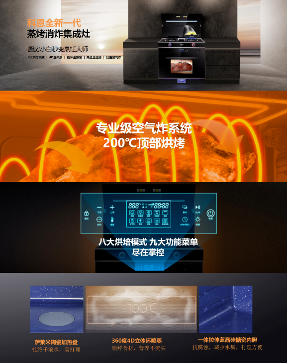C系列集成灶配備的四項行業(yè)領(lǐng)先創(chuàng)新技術(shù):火力精控系統(tǒng)、納米無指紋易潔工藝、超級消毒系統(tǒng)、蒸烤消炸混動系統(tǒng)——直擊當下消費痛點,徹底解決用戶使用需求,從大火力大吸力、易清潔易打理、廣收納懂消殺、多功能全集成四個維度力破當下行業(yè)四大頑固堵點。