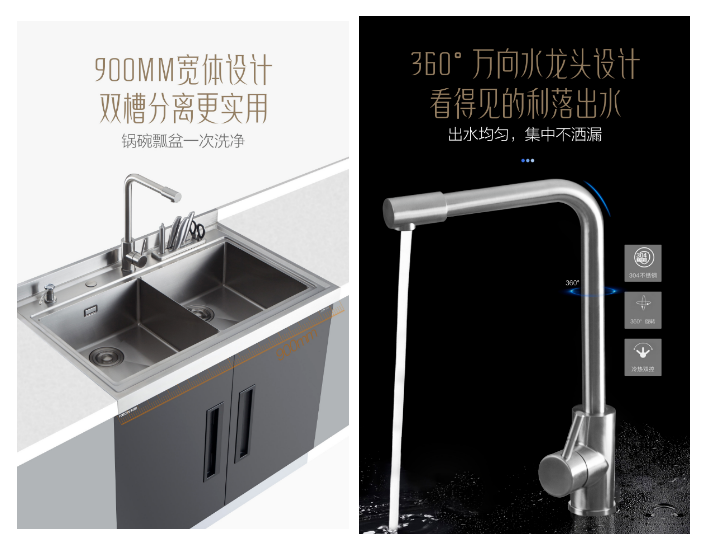 空間優化+功能整合,集食材分割、水洗清潔、熱水系統、凈水系統、垃圾處理、收納儲物于一體,多功能臺面設計,皂液器、加厚實木菜板、萬向水龍頭、通用不銹鋼刀架、手工打磨水槽等功能,每一處細節堪稱完美,整體造型優美別致,同時兼顧實用性。