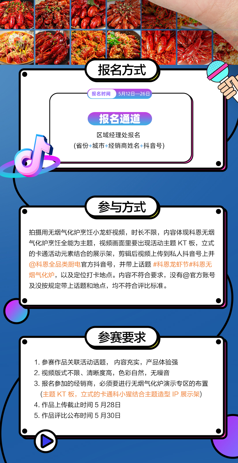 五月的煙火氣,藏在小龍蝦肥美的蝦鉗里,藏在氣化爐的勁焰猛火中,爐力全開,鉗動江湖。5 月12日——5月26日,一場舌尖與視覺的雙重盛宴拉開序幕!科恩龍蝦節抖音短視頻PK大賽重磅來襲,誠邀全國科恩專賣店,共赴這場創意與實力的較量,用鏡頭記錄無煙料理的無限可能。