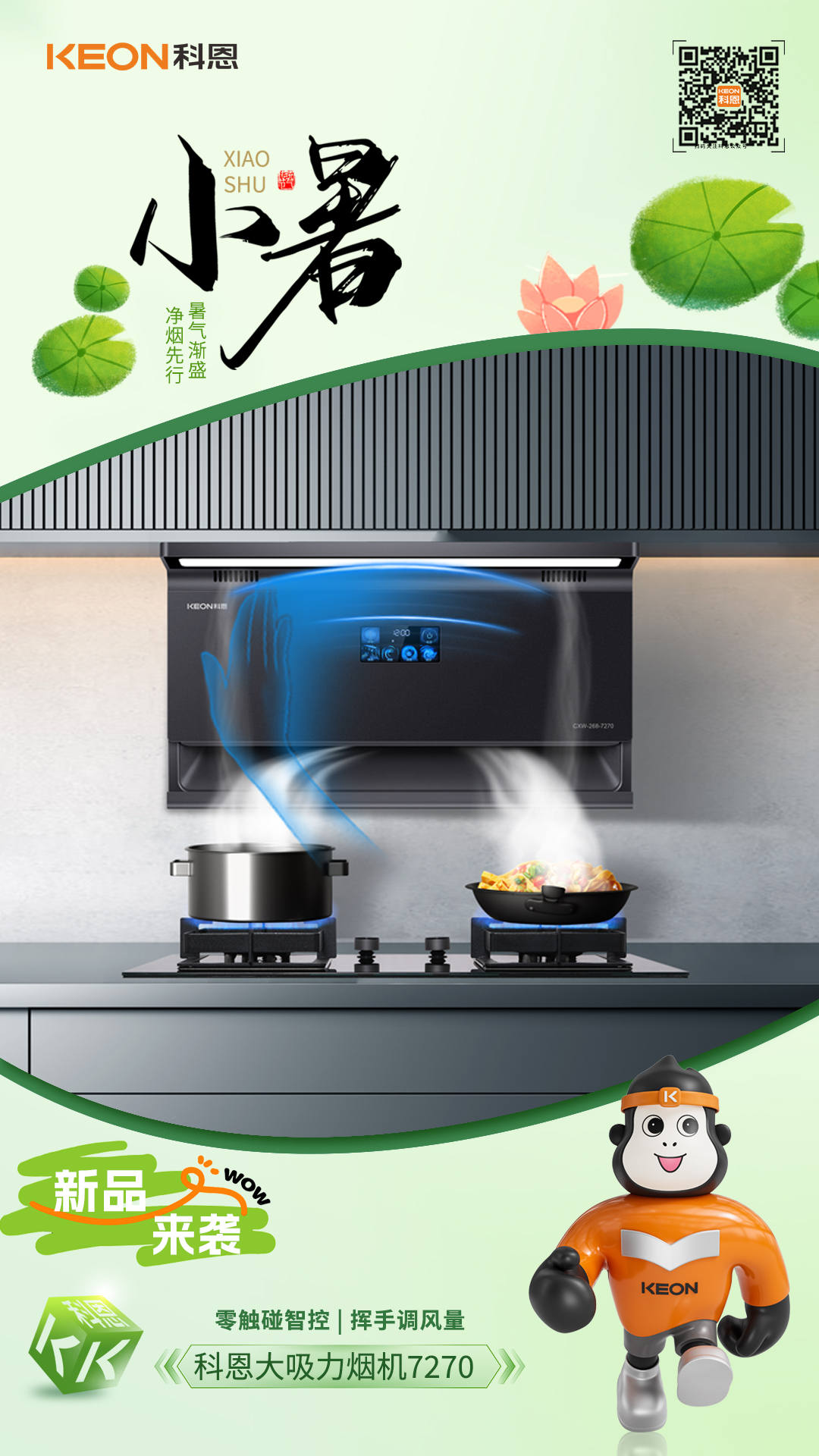 蟬鳴初起,熱浪翻涌。小暑時節(jié)廚房成高溫重災(zāi)區(qū),油煙升騰中包裹著暑氣更顯煩躁,科恩7270煙機攜25m³/min暴風吸力來襲,為廚房筑起清涼防線,讓凈煙快一步,生活慢享受。