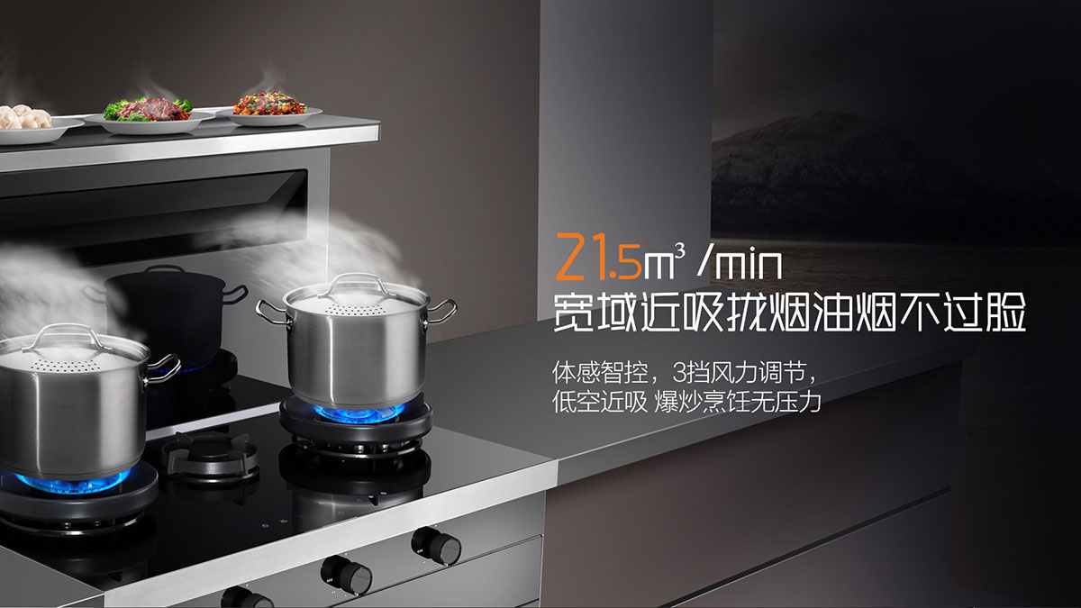 - 一級能效,21.5m3/min寬域近吸攏煙,油煙不過臉,烹飪更隨心