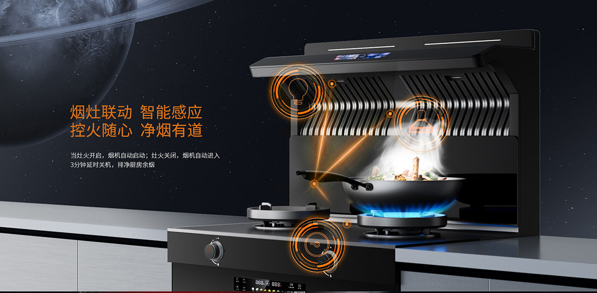 - 煙灶聯(lián)動,點(diǎn)火煙機(jī)及照明燈自動開啟;三分鐘延時,自動掃除殘留煙油
