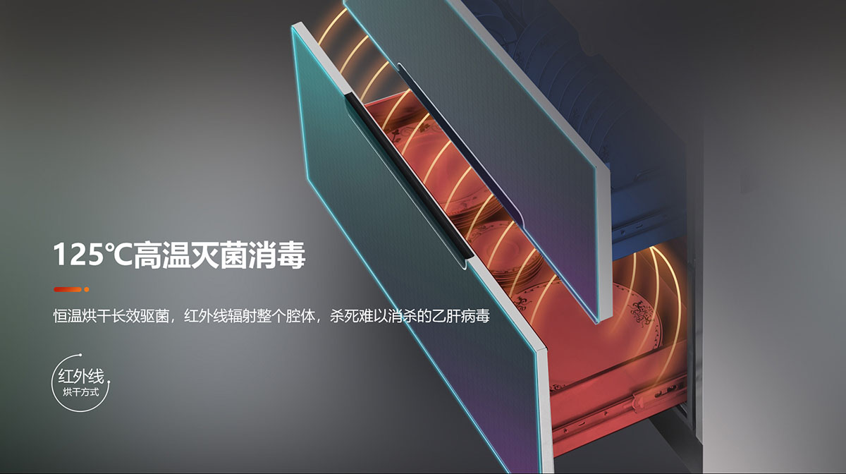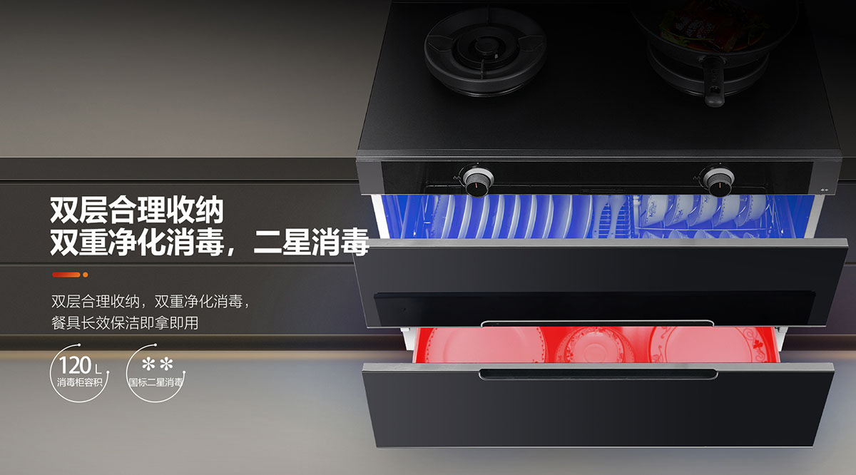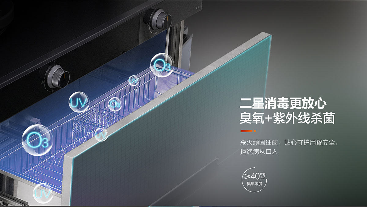 - 120L大容量消毒柜,采用臭氧與紫外線雙重消毒