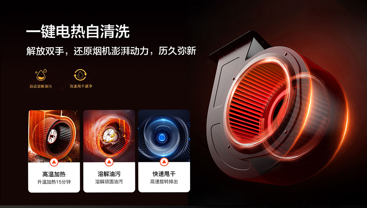 - 一鍵電熱自清洗,解放雙手,還原煙機澎湃動力,歷久彌新