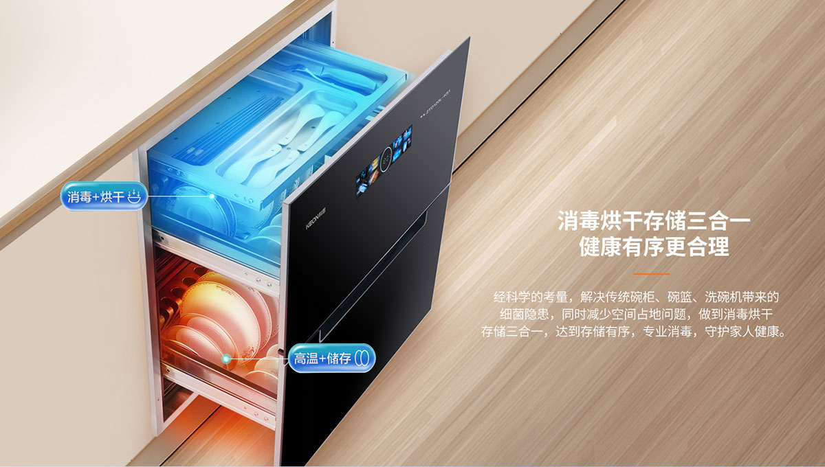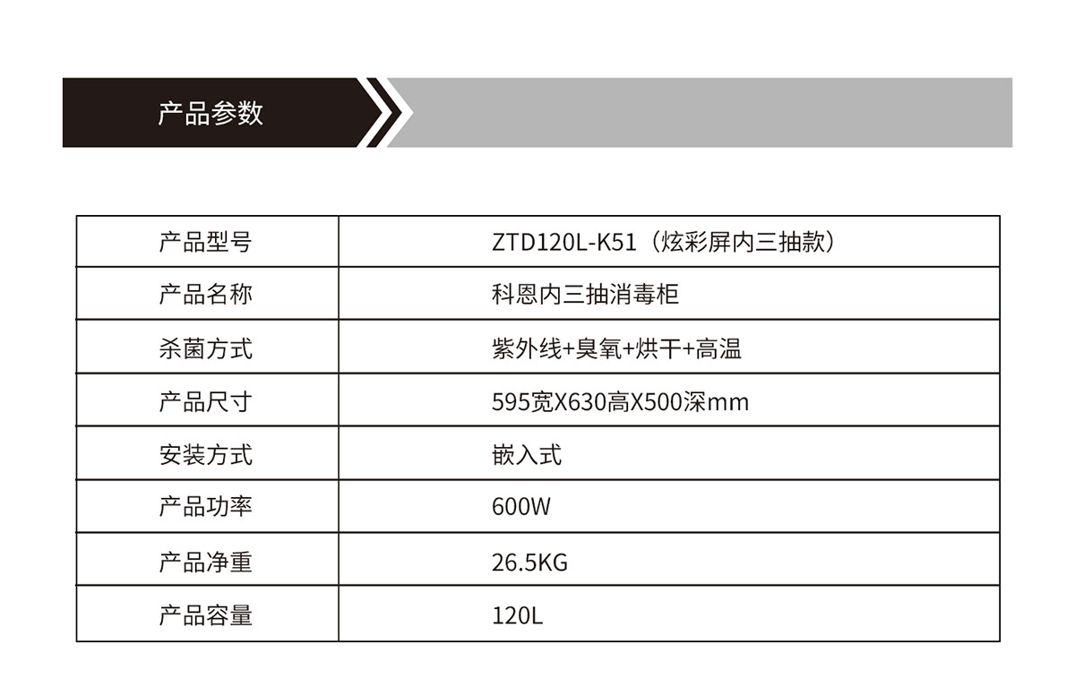 產(chǎn)品型號(hào):ZTD120L-K51(炫彩屏內(nèi)三抽款)產(chǎn)品名稱(chēng):科恩內(nèi)三抽消毒柜