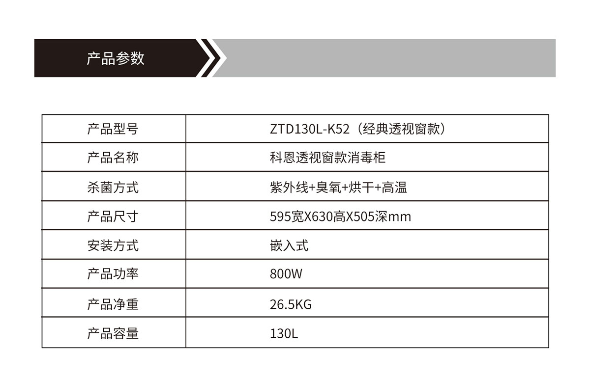 產(chǎn)品型號:ZTD130L-K52(經(jīng)典透視窗款)產(chǎn)品名稱:科恩透視窗款消毒柜