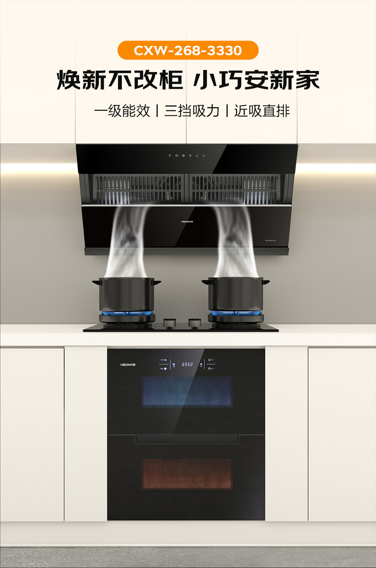- 895MM寬屏攏煙,雙灶同烹,從容應對