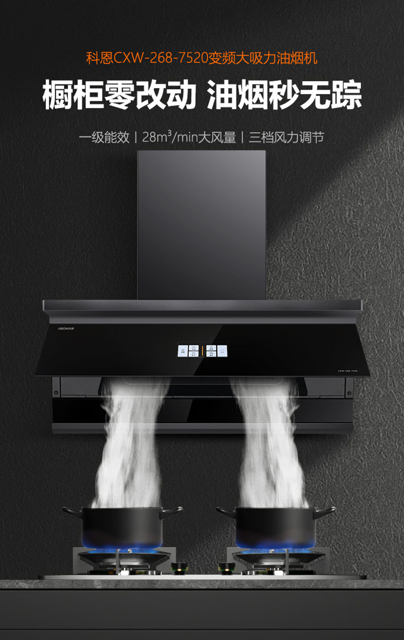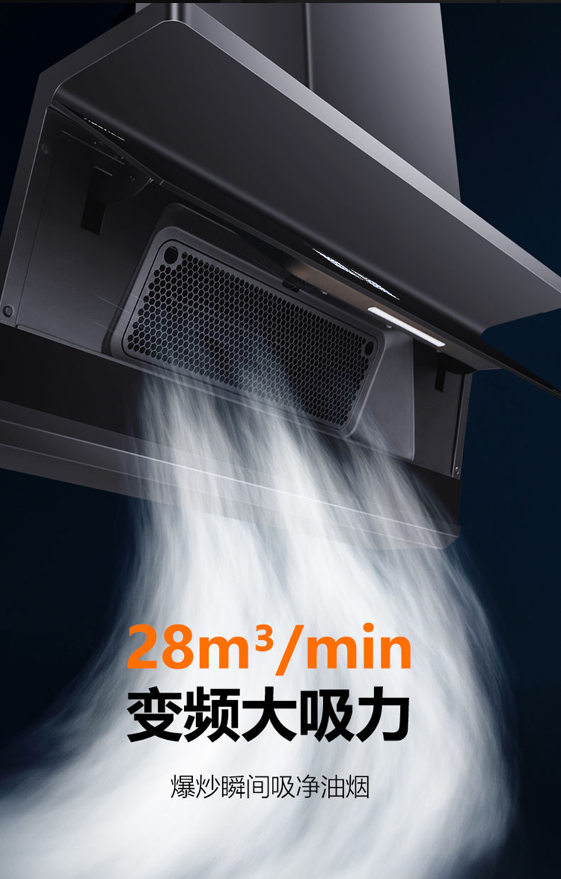 - 28m³/min颶風吸力,爆炒瞬間吸凈油煙
